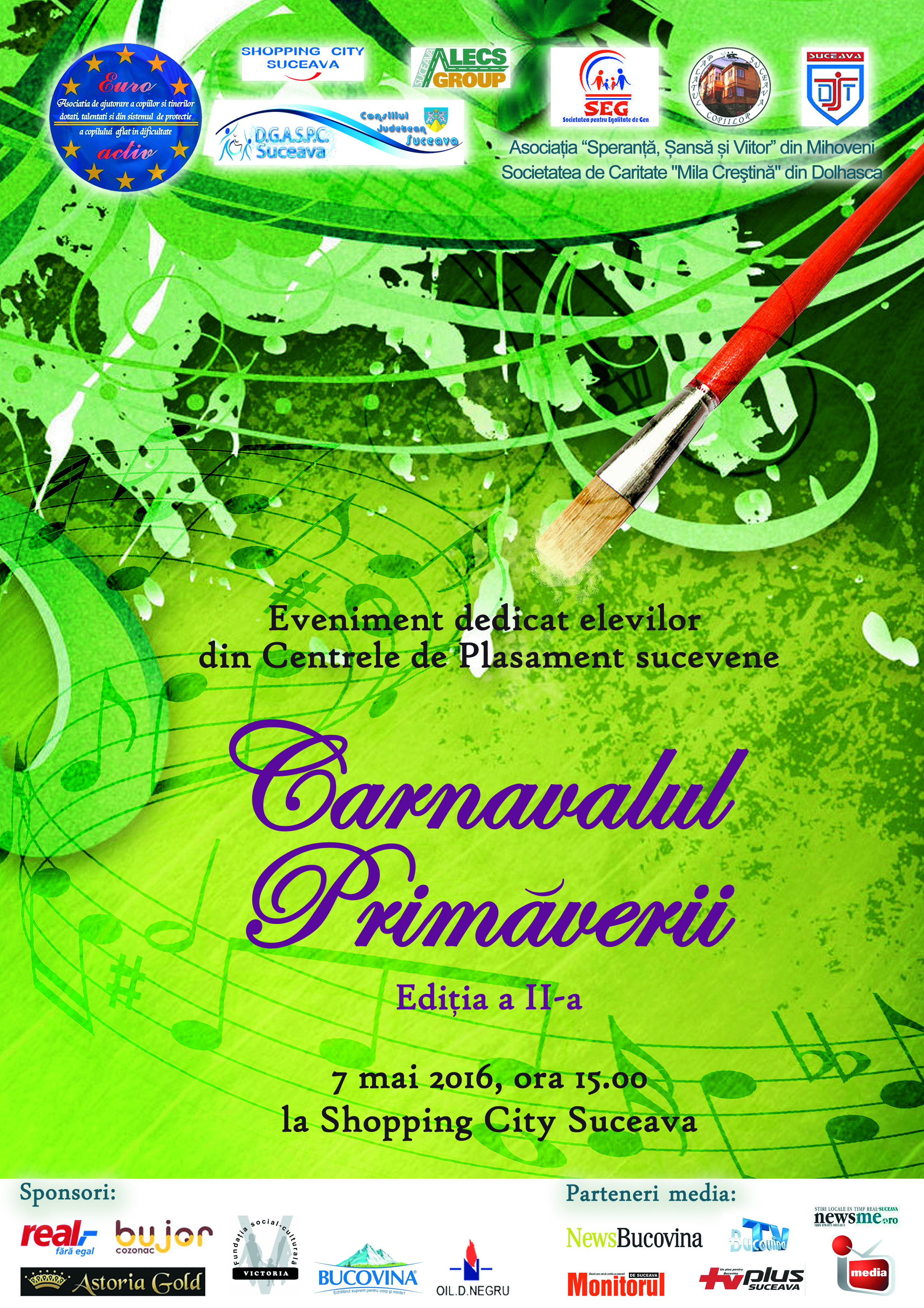 Asociaţia de ajutorare a copiilor şi tinerilor dotaţi, talentaţi şi din sistemul de protecţie a copilului aflat în dificultate „EUROACTIV” Suceava şi Asociaţia Societatea pentru Egalitate de Gen SEG, în parteneriat cu Shopping City Suceava, Palatul Copiilor Suceava, Direcţia Generală de Asistenţă Socială şi Protecţia Copilului Suceava, Direcţia pentru Tineret a Judeţului Suceava, Asociația “Speranță, Șansă, Viitor” din Mihoveni, Societatea de Caritate “Mila Creștină” din Dolhasca şi, Asociaţia „Alecs Group”, au organizat concursul judeţean „Carnavalul Primaverii” ediţia la a III-a la Shopping City Suceava în data de 7.05.2016, unde au participat copii din 5 unităţi de asistenţă socială: Servicii Multifuncţionale pentru copilul aflat în dificultate – Gura Humorului, Servicii Multifuncţionale pentru copilul aflat în dificultate – Fălticeni, Casa de tip familial „Sf. Gheorghe” din Dolhasca, Centrul de Plasament “Mihail și Gavril” din Solca, Centrul de Plasament “Speranța” din Suceava.